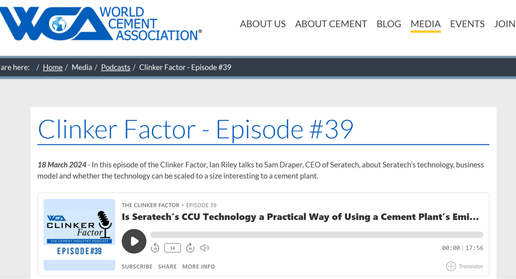 Sam Draper, Seratech CEO, was invited on the Clinker Factor podcast hosted by Ian Riley of the World Cement Association (WCA) which aired earlier this month. Sam spoke about Seratech's technology, business model and scaling up. Have a listen!