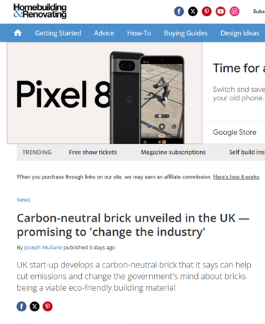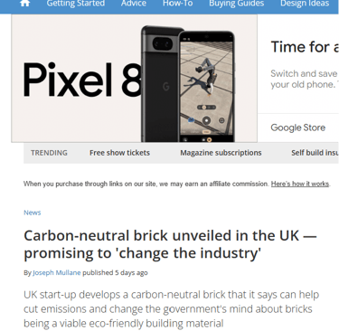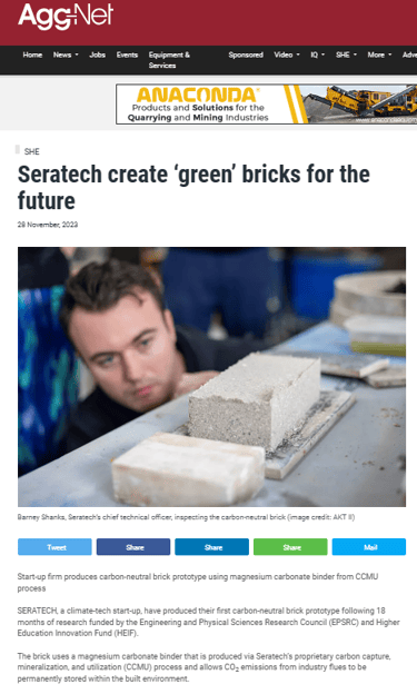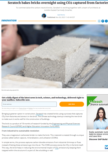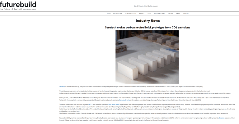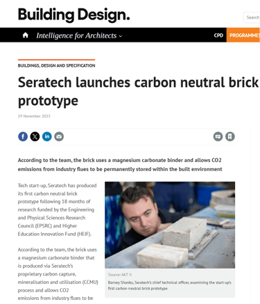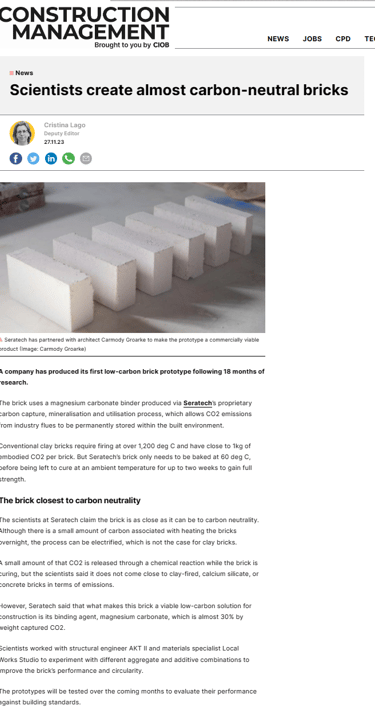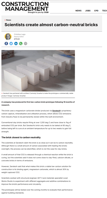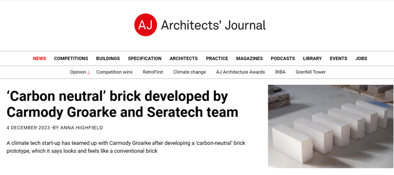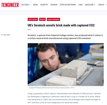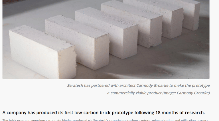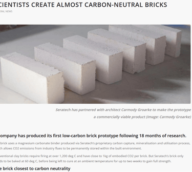 In October this year, Seratech teamed up with architects Carmody Groarke, Engineering firm AKT II and Local Works Studio to make a carbon neutral brick using Seratech's magnesium carbonate binder made from CO2 emissions. And the press caught on...