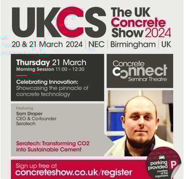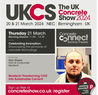 Earlier in the year Sam attended the UK Concrete Show and UK Construction Week's Concrete Expo where he gave presentations at both events about transforming CO2 into sustainable cement. Sam highlighted the challenge faced by innovators like Seratech is to make sure the technology tightly fits the parameters required by all stakeholder in the concrete value chain, so that it can also offer benefits in terms of performance, material availability or cost.